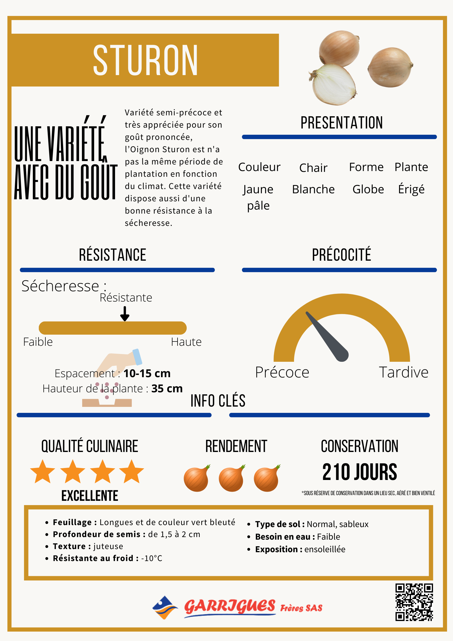La variété Sturon se caractérise par un très gros bulbe légèrement aplati. On la confond souvent avec la variété « Pailles des Vertus » en raison de sa couleur jaune cuivrée et de sa chair blanche. La période de récolte de cette variété s'étend de juillet à août. De plus, cette variété présente une excellente résistance à la montaison.