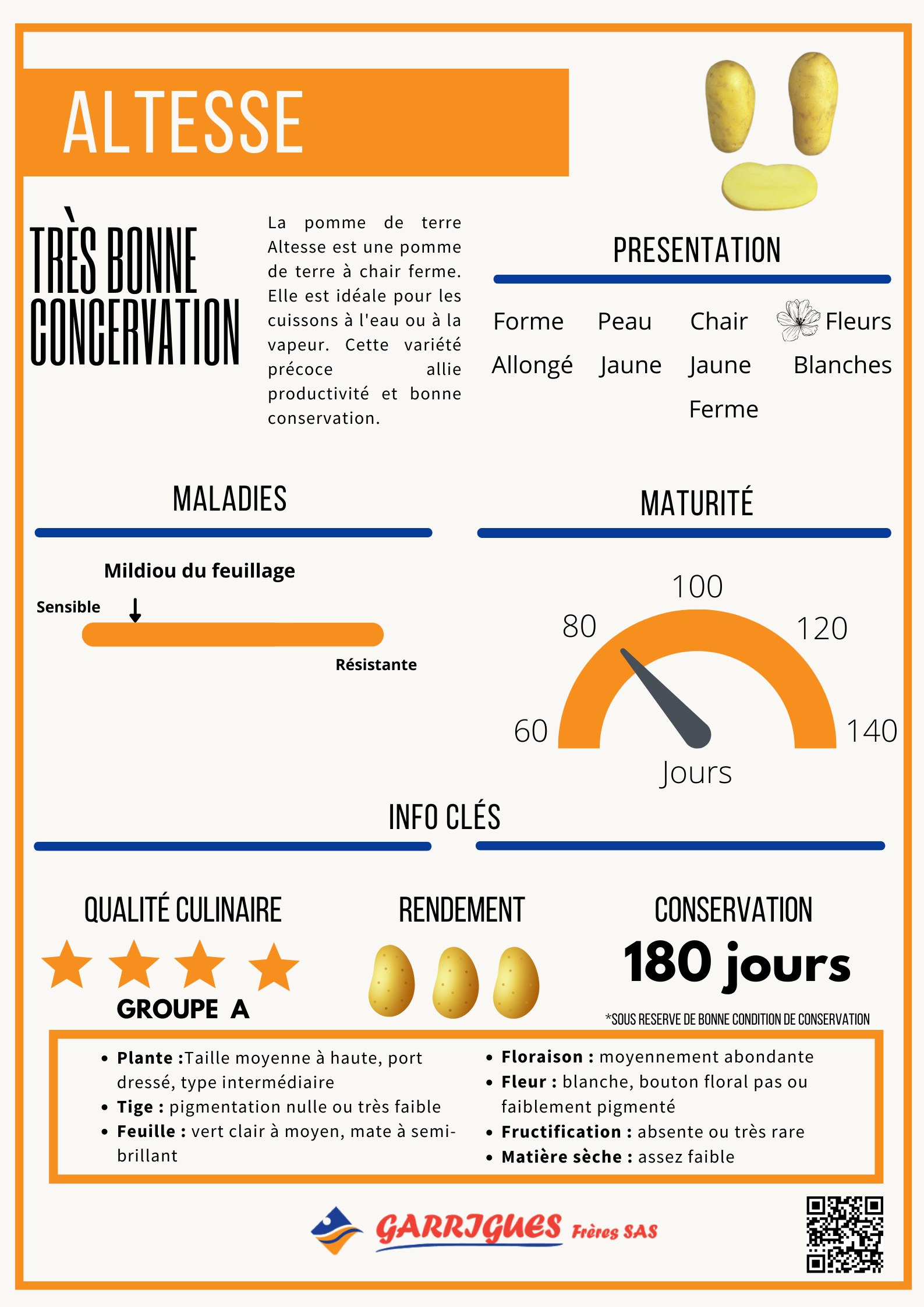 Son rendement et sa précocité sont équivalents à ceux de la Charlotte, mais sa conservation est meilleure. L'atout majeur de cette variété précoce est l'association d'une très bonne productivité à une bonne conservation.